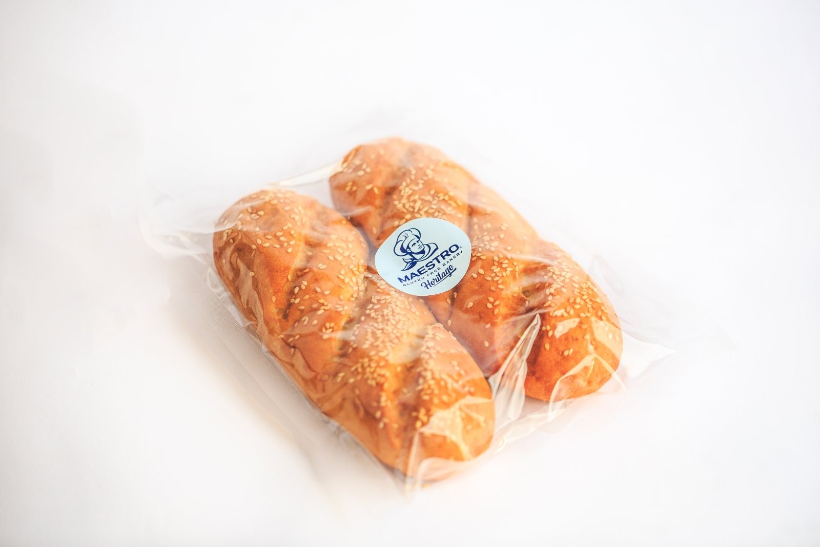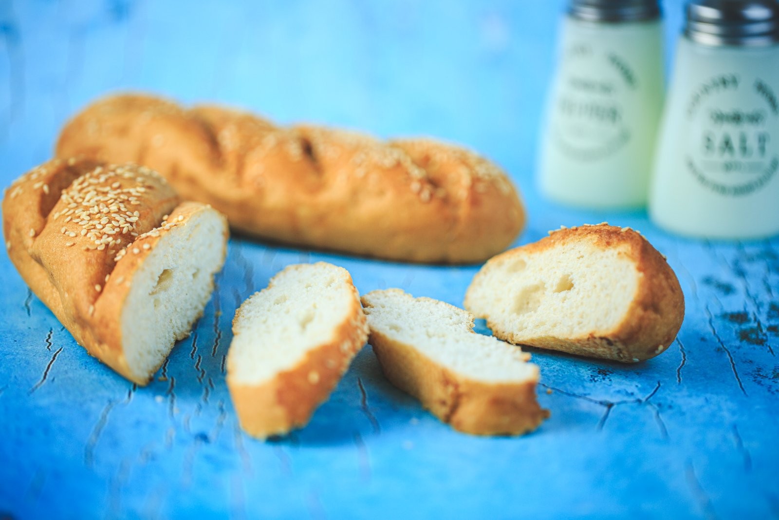 Оризово брашно, царевично нишесте, растителни фибри, СОЕВ протеин, декстроза, сгъстители (метил целулоза, ксантанова гума), суха млечно-кисела закваска (брашно от жълта леща, растителна млечна киселина, лимонена киселина), ензими, вода, слънчогледово масло, инстантна мая, сол, поръска: СУСАМ и ЯЙЧЕН БЕЛТЪК. Опаковани в защитена газова среда.