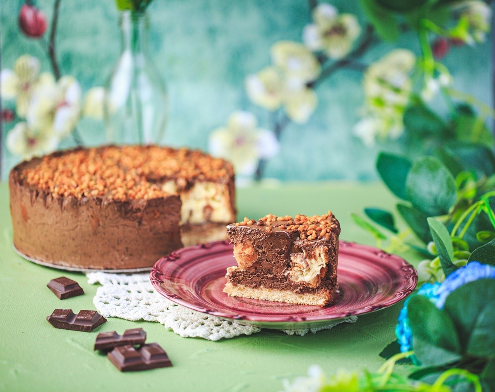 ЯЙЦА, МЛЯКО, СМЕТАНА, захар, слънчогледово масло, натурален шоколад (какаова маса, захар, какаово масло, емулатор: слънчогледов лецитин, полиглицерол, ароматизант: ванилия), царевично нишесте, оризово брашно, СОЕВ изолат, фибри от псилиум, декстроза, стабилизатор (карбоксиметил целулоза), емулгатор (хидроксипропилметил целулоза), суха млечно-кисела закваска (брашно от жълта леща, растителна млечна киселина, лимонена киселина), дрождев екстракт, ензими, вода, набухвател: бакпулвер; сух ЯЙЧЕН меланж, обезмаслено сухо МЛЯКО,ФЪСТЪЧЕН крокан