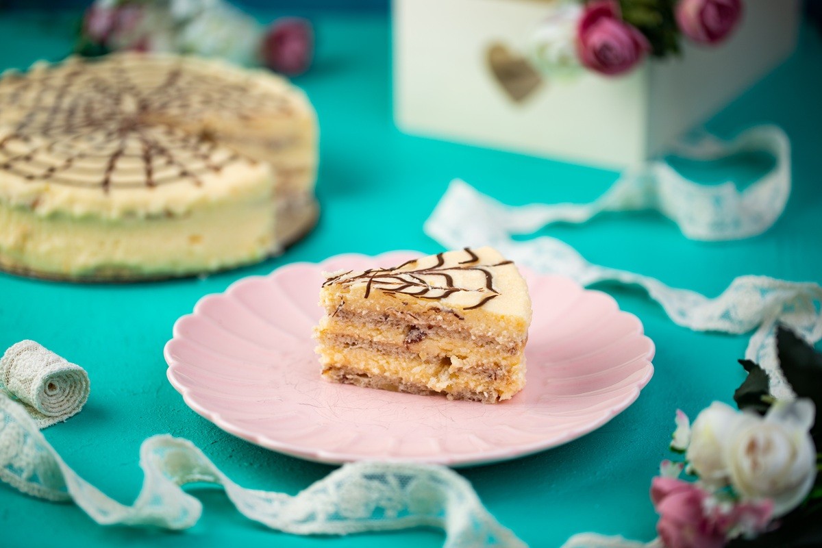 Емблематичната унгарска класика вече в по-здравословен вариант! Торта Естерхази впечатлява с фини бадемови блатове, изпечени до съвършенство, и нежен млечен крем, съчетани с характерната глазура и изящна украса.